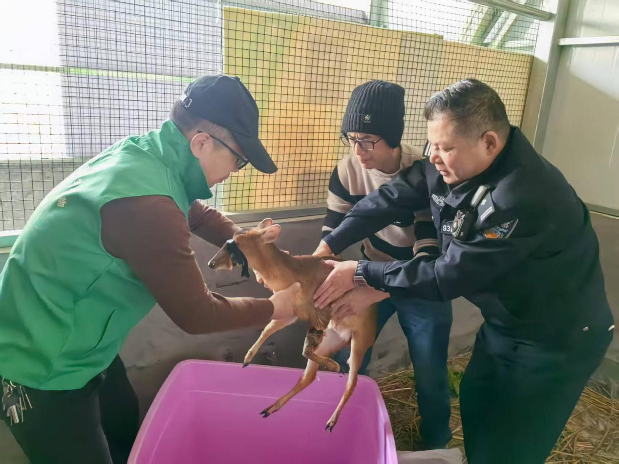 1月3日,福鼎市野生动物救助站接收福鼎市公安局森林警察大队送来的一只受伤的野生黄麂。经检查,被救黄麂为雌性,体重约15公斤,前肢有轻微伤。经过一段时间治疗,这只黄麂已能够正常活动,符合野外放生条件。15日,福鼎市林业局、市公安局森林警察大队及市野生动物救助站工作人员在适宜生存区域共同将黄麂放归大自然。