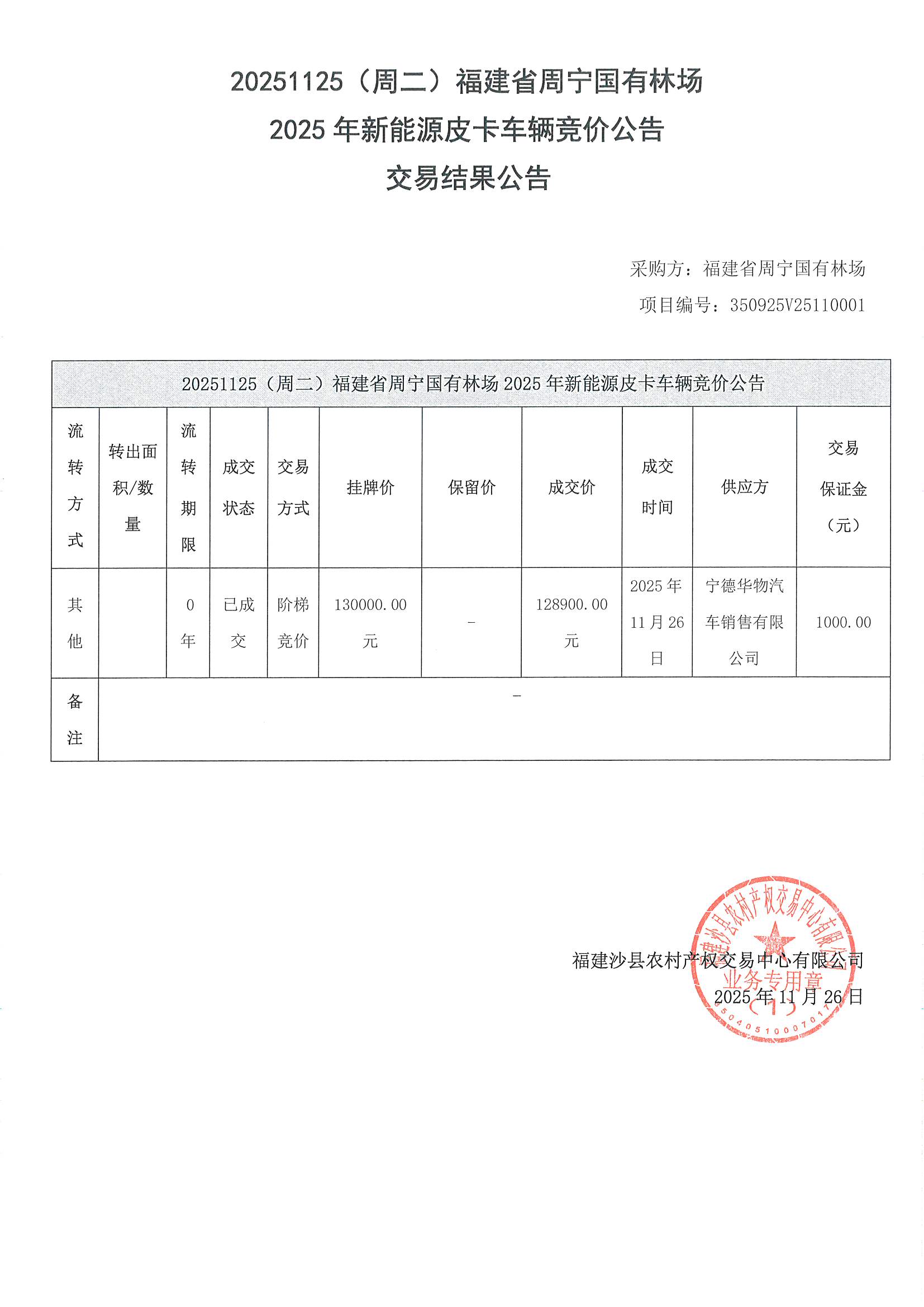 周宁国有林场2025年新能源皮卡车辆竞价公告交易结果公告