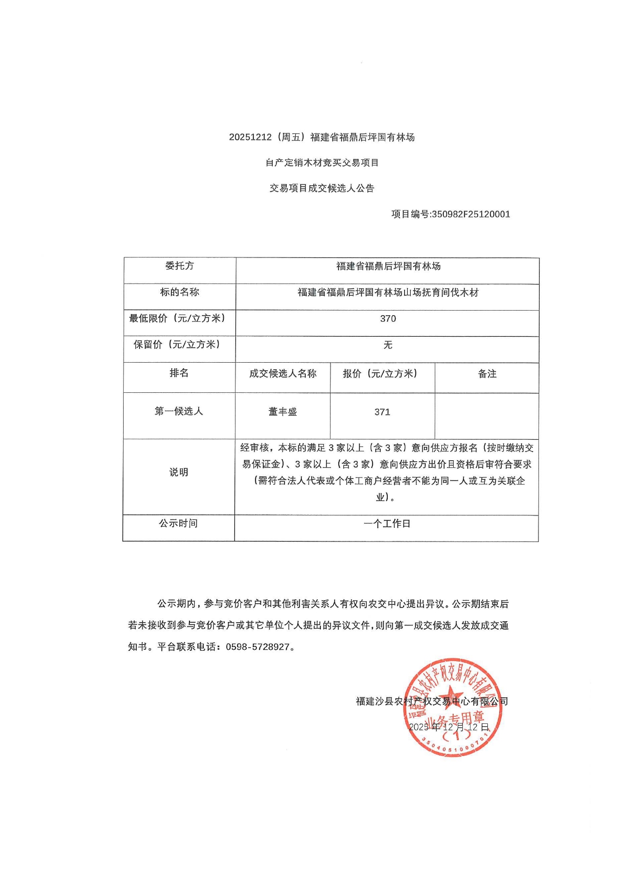 福鼎后坪国有林场自产定销木材竞买交易项目成交候选人公告